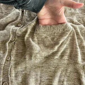 Description: Lightweight button front v-neck cardigan with two front pockets. 55% Linen 45% Polyester blend. Elastic cuff at sleeve. Women's size large sweater.