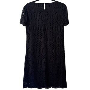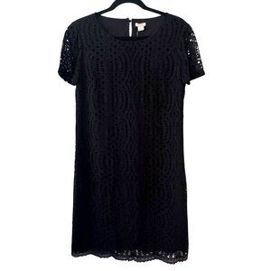 J. Crew black lace dress with scalloped hem and short sleeves. This straight silhouette dress is fully lined. Classic LBD! In excellent pre-loved condition.