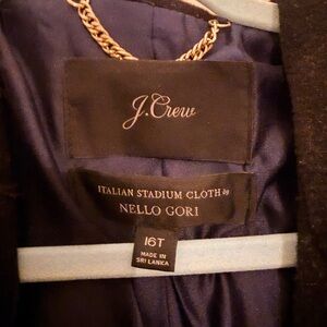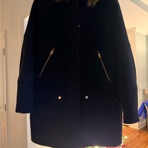 Chic black coat by J. Crew. Features a stylish faux fur collar.