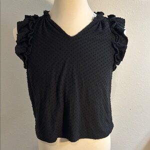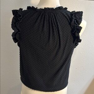 This elegant black blouse features a sleeveless design with charming ruffled details and a smocked texture, offering a stylish and comfortable fit. Perfect for any occasion, its sophisticated style effortlessly combines casual comfort with feminine flair.
