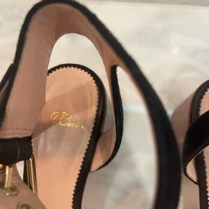 Chic black suede sandals with a sturdy 2.5" block heel. Features a stylish ankle strap with gold hardware. EXCELLENT Preowned CONDITION.