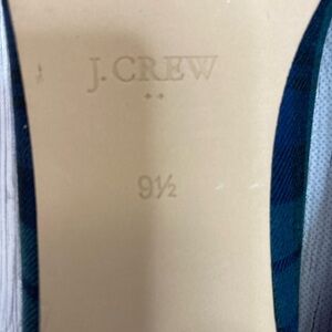 Trendy J. Crew dark navy blue and green tartan plaid flats with bow in front and a minimal heel.