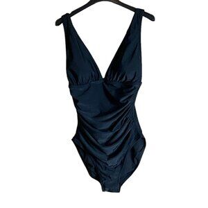 Elegant black one-piece swimsuit. Features deep V-neck and ruched waist. Perfect for a sleek beach look.