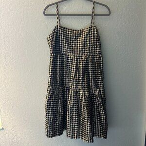 I am selling a gently used J. Crew black and gold gingham party dress with adjustable spaghetti straps.