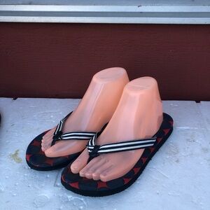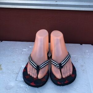 J Crew Black and Red Flip Flops with Striped Straps Shoes Size 7. Stylish flip flops featuring black and red patterns with striped straps. Perfect for casual wear.