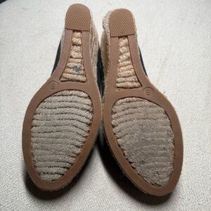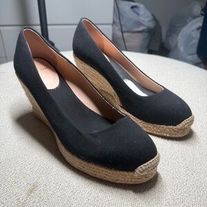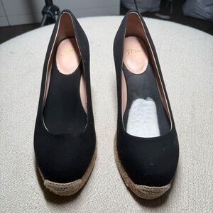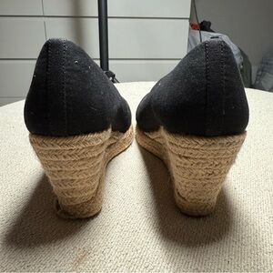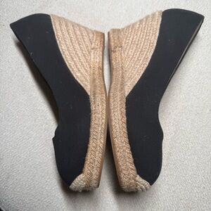 Elegant black wedges with tan espadrille detailing. Perfect for versatile styling. Left shoe has an adhesive padding that can be removed