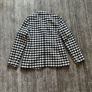 Stylish checkered blazer. Features black and white pattern. Gold button accents. Perfect for formal occasions.