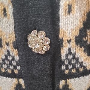 Elegant black cardigan with white geometric design. Features decorative buttons. Ideal for layering.