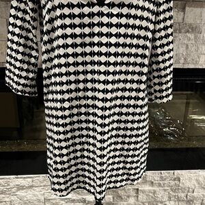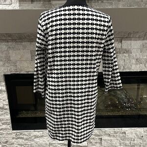 Black and white J crew Tunic top with a diamond pattern. Features a deep neckline and three-quarter sleeves. Small slits on sides