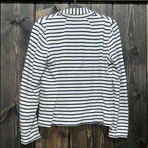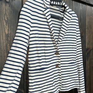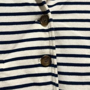 J. Crew brand button front cardigan. Blazer style with the softness & stretch of a sweater. Size x-small. Striped. Classic look. Faux pockets. Off-white & navy blue. Preloved. Please see all photos for condition.