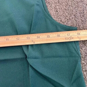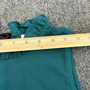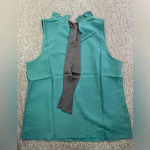 Beautiful, elegant and classy. Forrest green sleeveless blouse. Ruffle accent around neckline. Pull over shirt with a black bow tie closure along the back. 100% polyester adds for a silk texture and lightweight. Easy care. Keep it casual with jeans and mules or wedges. Dress it up with a blazer and heels or slacks with heels. Great for most occasions.