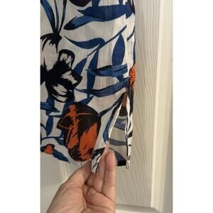 The J. Crew Blouse is a stylish women's tunic top in a small size, featuring a floral pattern in blue color. This 3/4 sleeve blouse has a V-neckline and a pullover closure, making it versatile for travel, parties, or casual occasions. Made of 100% cotton with a woven fabric type, this relaxed fit blouse is designed for all seasons and incorporates beach, bohemian, and tropical themes. Perfect for a trendy and comfortable look for any occasion.