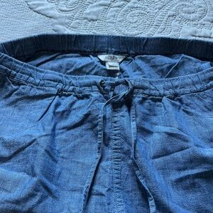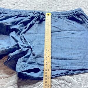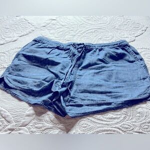 These J. Crew blue jean shorts offer a stylish distressed look with a raw cut-off hem, perfect for a laid-back day. The classic blue color and natural wear patterns provide a timeless appeal, making them a versatile addition to any casual wardrobe.
