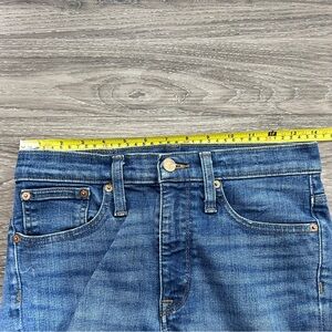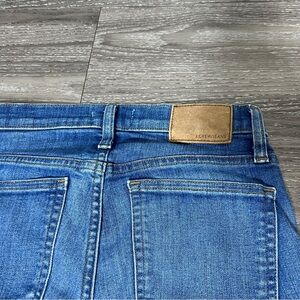 These J. Crew jeans feature a classic blue hue with a medium wash, offering a slightly faded, casual look. The flare and wide leg design adds a touch of retro style, perfect for making a statement. The subtle color variations in the denim enhance their timeless appeal.