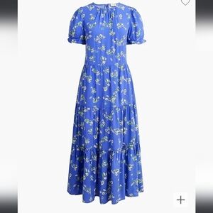 J. Crew Blue Floral Puff Sleeve Tiered Midi Dress Boho Peasant Flowy Beachy L