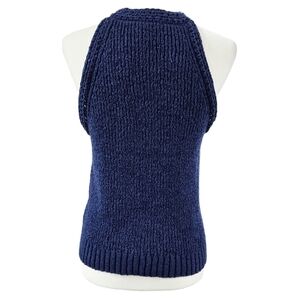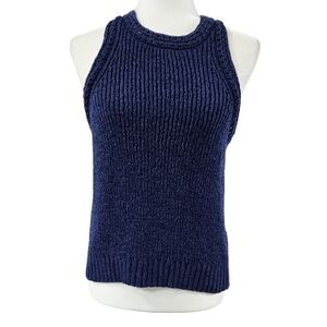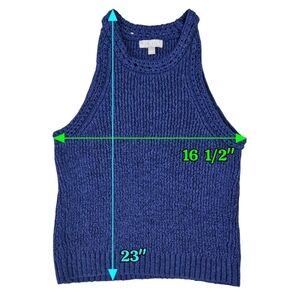 Good used condition, with no stains or tears. A comfortable and stretchy blue sweater tank. Has a crew neck and crochet trim.