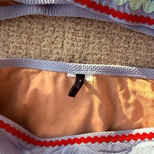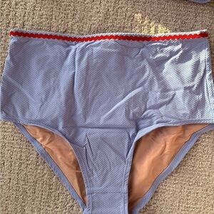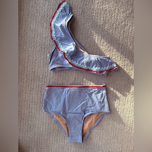 Adorable two piece swimsuit from J Crew. Light blue with red and blue piping. Ruffle one shoulder top and high waist bottom. Both size XS but fits more like a S.
