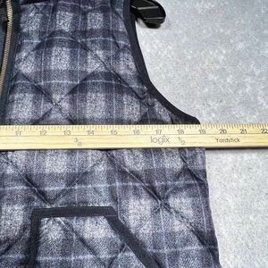 Stylish quilted vest with a blue plaid pattern. Features a front zipper and two pockets. Perfect for layering.