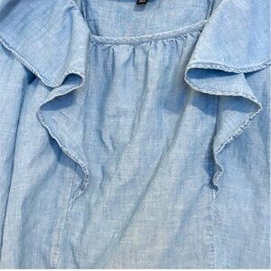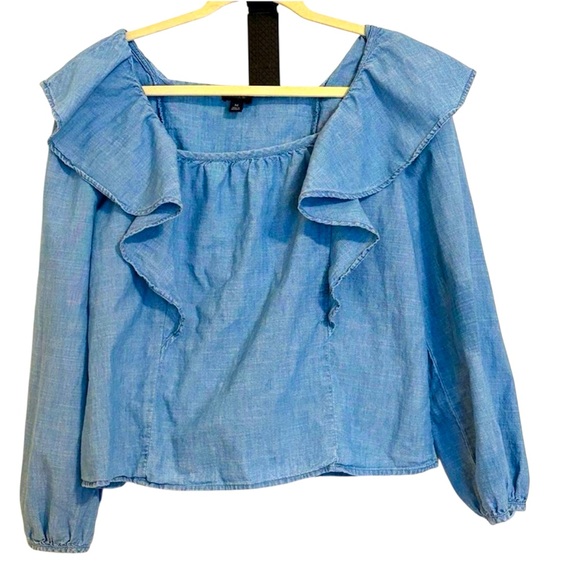 Chic blue blouse with elegant ruffle details. Long sleeves. Perfect for casual or dressy occasions.