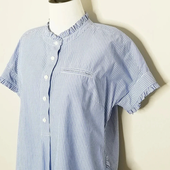J. Crew blue and white Pinstripe short sleeve popover blouse with ruffle trim detail at sleeves and sides. Excellent preowned condition.