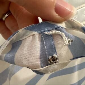 J. Crew top. Sleeveless with semi-fitted chest and relaxed thru stomach. White background with medium blue horizontal stripes. Very lightweight and semi sheer polyester material. Scoop neckline. Back has small keyhole with one fabric covered button. Has snaps to hold bra strap in place. Has 3 faint stains. Small snag on back. Be careful with jewelry near it. See closeups. Size 0. 16.5” pit to pit & 23” long. Feel free to make a reasonable offer. Or browse & message me for a great bundle deal!