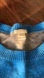 Stylish crew neck sweater. Features blue body with gray sides. Elbow patches add a unique touch.