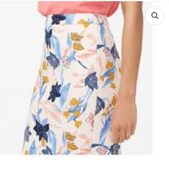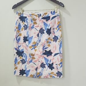 This knee-length pencil skirt from J. Crew features a vibrant floral design with bold blue and orange hues, perfect for resort wear. Its fitted silhouette and artistic pattern add a modern touch to your wardrobe, making it a versatile piece for various occasions.