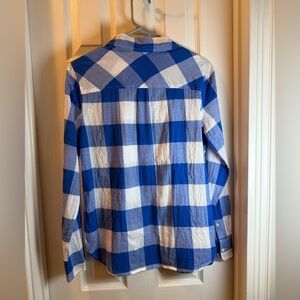 Chic J. Crew shirt with a blue and white checkered pattern. Ideal for casual outings. Lightweight, perfect for spring and summer. Shirt tell him can be worn tucked in, half tucked or out.