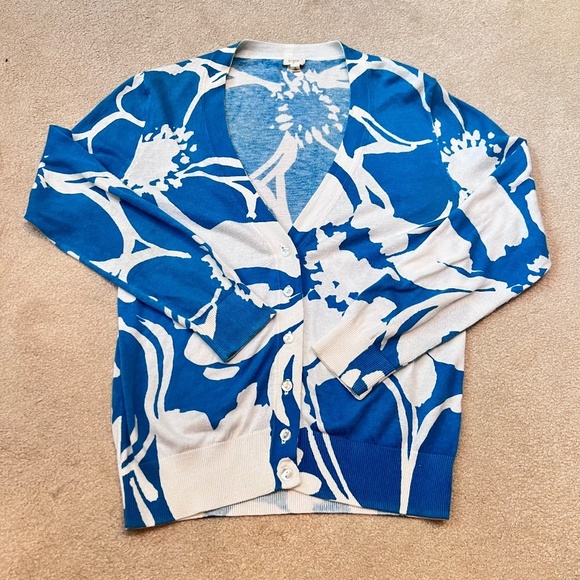J. Crew Blue and White Floral Cardigan V-Neck Buttons Spring Lightweight Resort