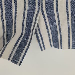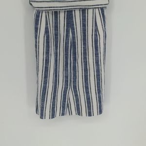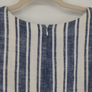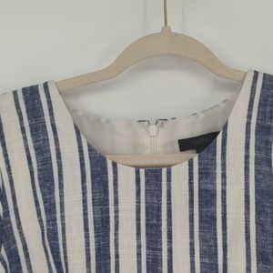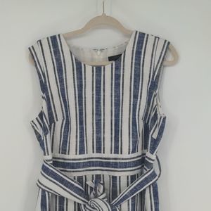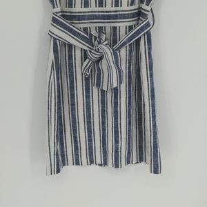 Stylish mini dress with blue and white stripes. Features a flattering tie waist. Sleeveless design for a chic look.