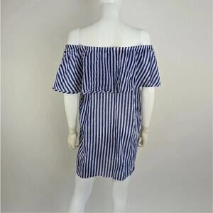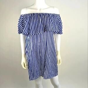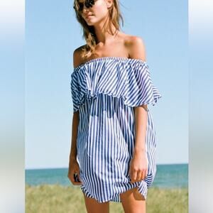 This J Crew dress is perfect for a summer day! The off-shoulder design is both stylish and comfortable. The blue and white stripes add a classic touch. It is in excellent condition, ready to wear.