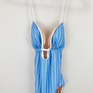 Stylish one-piece swimsuit. Features blue and white stripes. Halter neck design. Super cute, would love to keep if it fit me better.