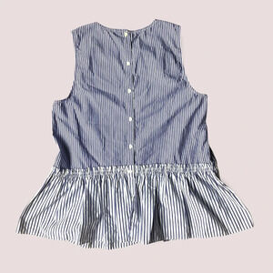 Elegant tank with blue and white stripes. Features a peplum design. Sleeveless and modern.