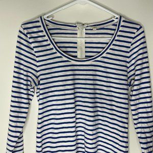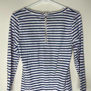3/4 length sleeves, scoop neck, exposed zipper on the back, light weight blue and white striped top from j. crew