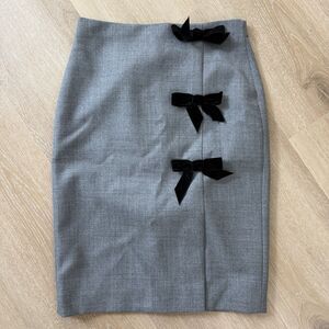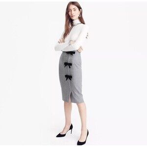 J. Crew Bow Seam Pencil Skirt in Double-Serge 100% Wool Heather Graphite Gray Size 4. Gorgeous black velvet bow accents. Excellent condition. Fully lined. Great for work, holiday party, cocktails, dress it up or down.