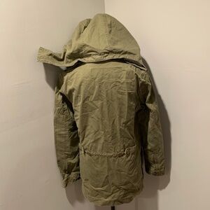 J. Crew Boyfriend Fatigue Jacket in green. 4 patch pockets on front with button and flap closure. Full zip closure. Hooded. Women's size small. Theres these marks along collar but looking at other listings I see they have them too and think it has to do with stitching on other side. Gently used condition.