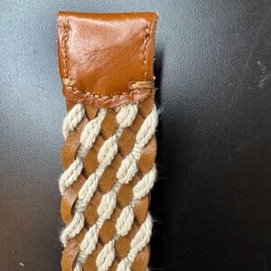 Elevate your everyday style with this charming J. Crew belt. A delightful woven design features a blend of tan leather and cream-colored rope, creating a visually appealing texture that adds a touch of bohemian flair to any outfit. The rich tan leather accents complement the braided pattern, while the classic brass-tone buckle provides a secure and stylish closure. This belt is perfect for cinching a flowy dress at the waist, adding a touch of sophistication to your favorite jeans, or completing a casual chic look with a tunic top.
