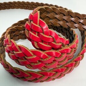 Elevate your style with this chic braided belt. Featuring a striking red and brown design, it's perfect for adding a pop of color to any outfit. Ideal for casual or formal wear.