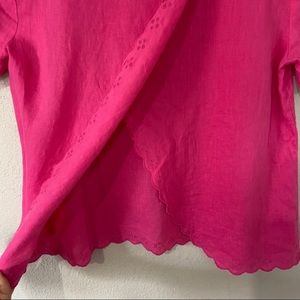 Soft, breathable and easy care 100linen, this Fuchsia Blouse has split-back detailing to move with you wherever adventure takes you. Short Sleeves scallops hem detail loose fit.