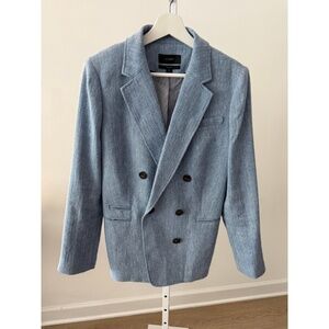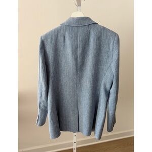 Linen/cotton/poly. Notch collar with felt undercollar. Functional buttons at cuffs. Relaxed fit. Double breasted. Chest pocket, hip welt pockets. Interior pocket. Back vent. Lined. Dry clean.