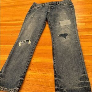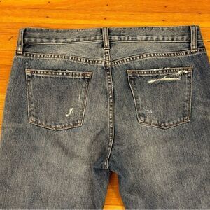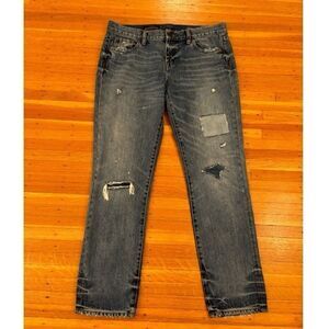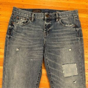 J. Crew Broken In Boyfriend Distressed Jeans. 2 pockets in front and back. Belt loops. Some heel drag. 100% cotton. Waist across front 17 inches. Rise 9 1/2 inches. Inseam 27 1/2 inches. Size 28. Great condition!