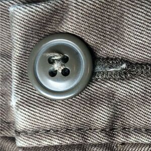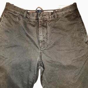 These chinos have a deliberate broken in faded appearance. They have slant front pockets and welt back pockets. They are made of 100% cotton twill fabric. In good used condition. There is a mark on one leg (see pics).