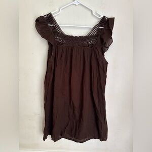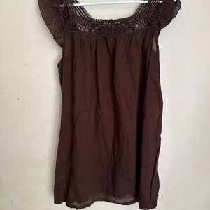Elegant brown top with crochet detailing. Sleeveless design. Perfect for casual wear.