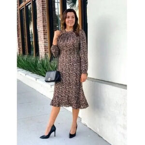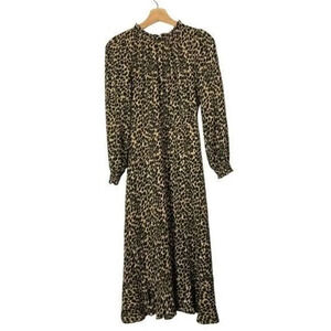 J. Crew Brown Leopard Print Ruffle Neck Peasant Long Sleeve Midi Dress 0