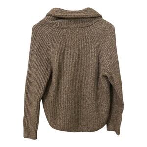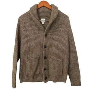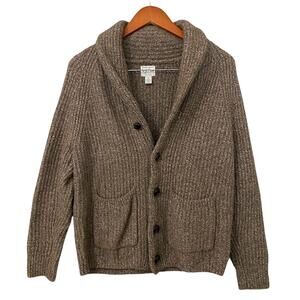 Stylish brown cardigan. Features ribbed texture. Button-up front. Shawl collar design. Perfect for layering.