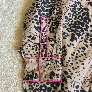 J Crew Brown Tan Black Leopard Print Button Down Shirt Blouse Linen Pink Trim