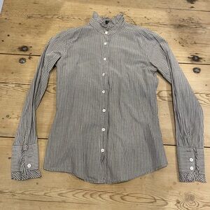 Stylish J. Crew top with ruffle detail in a size 4. Cotton shirting and shell buttons. A perfect piece for fall.