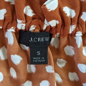 J. Crew Brushstroke Print Drapey Ruffleneck 365 Crepe Pullover Top, sz S, NWOT, made from J. Crew’s signature, luxe, wrinkle-resistant 365 crepe, this drape top features a split neckline that fans out into a ruffleneck collar, gathered sleeves, elegant white brushstroke print throughout on vibrant russet orangey/red brown, wear with your everyday jeans or with work trousers.
