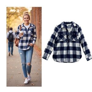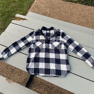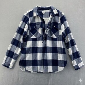 This cozy J. Crew buffalo plaid pullover is made from soft cotton flannel with a classic navy and white check pattern. It features a half-zip front, buttoned chest pockets, and a relaxed fit that makes it perfect for layering as a shirt or light jacket.