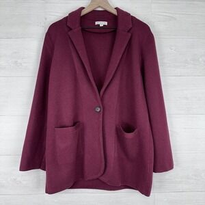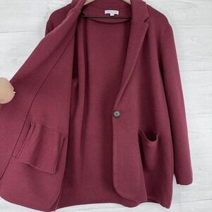 Elegant burgundy blazer. Single-button closure. Front pockets. Perfect for layering.